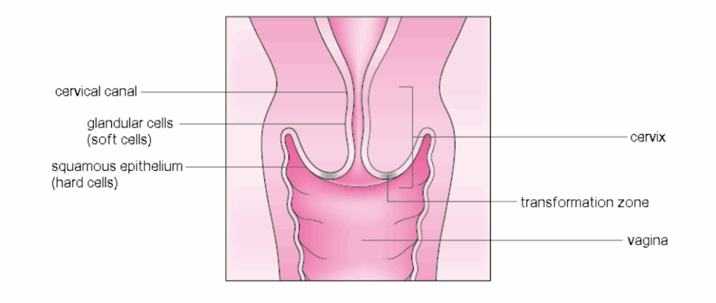 The area where the soft cells meet the squamous epithelial cells (hard cells), which are those found on the outer surface of the cervix, is called the transformation zone. If a woman has a cervical ectropion, it can be seen by the nurse during a cervical screening test (smear test) and the area appears red (because soft cells are red).