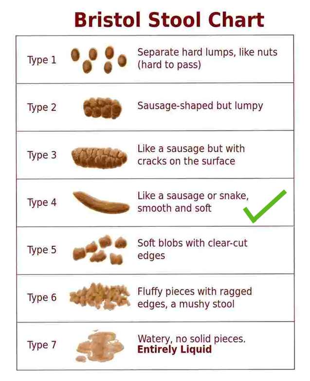 - Pass a soft, formed stool – like a smooth sausage or a snake – type 4 on the stool chart