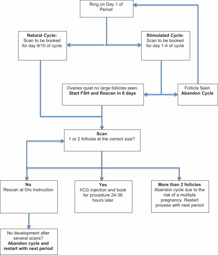 If you have a period or your pregnancy test is negative, you may start the cycle again or you may wish to wait for another period at a time that is suitable for yourself. Whichever you decide you need to contact the unit so that the appropriate appointments can be made.