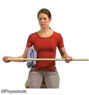 Place a rolled towel between your elbow and side if sitting down. Hold a stick with both hands.